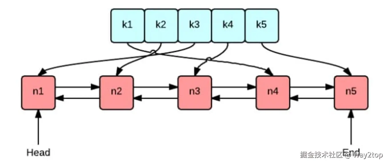 这张图很好地表示了 LRU 算法最核心的 2 个数据结构