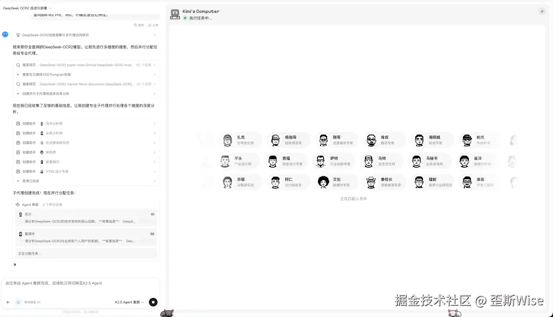 面对复杂任务,K2.5 不再是一个包揽一切的「全能专家」,而是化身为一支即时组建的「专业团队」。它能根据任务需求,现场调度多达 100 个分身,并行处理 1500 个步骤。所有的角色分配与任务拆解,无需预设,全由 K2.5 现场决策。