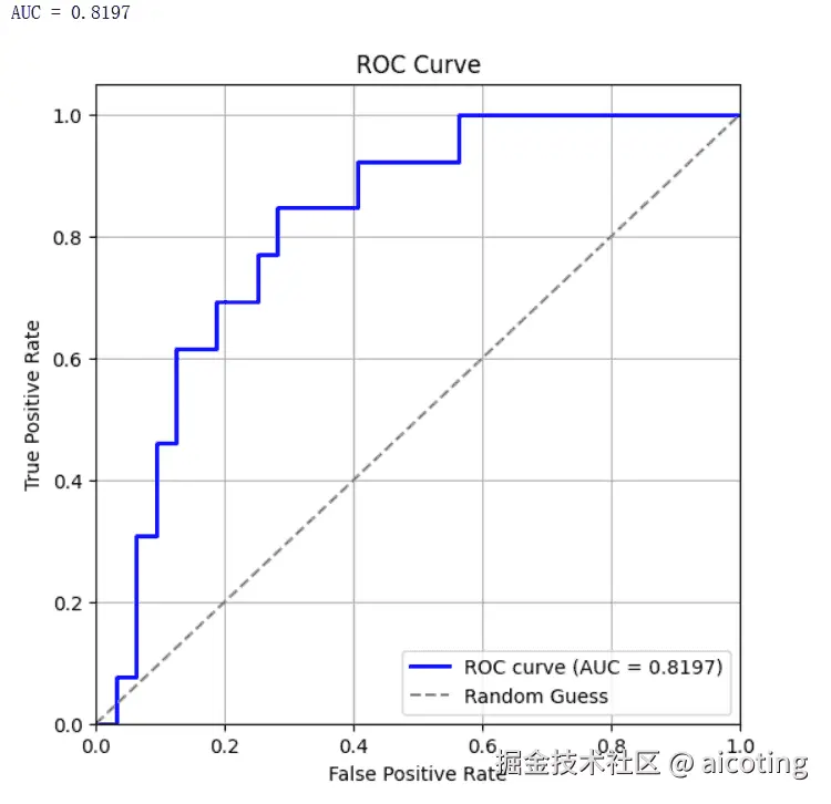 结果如下图,ROC 曲线展示模型在不同阈值下的分类能力。曲线越靠近左上角,说明模型越好。AUC=0.81 表示模型区分正负类的能力较强。