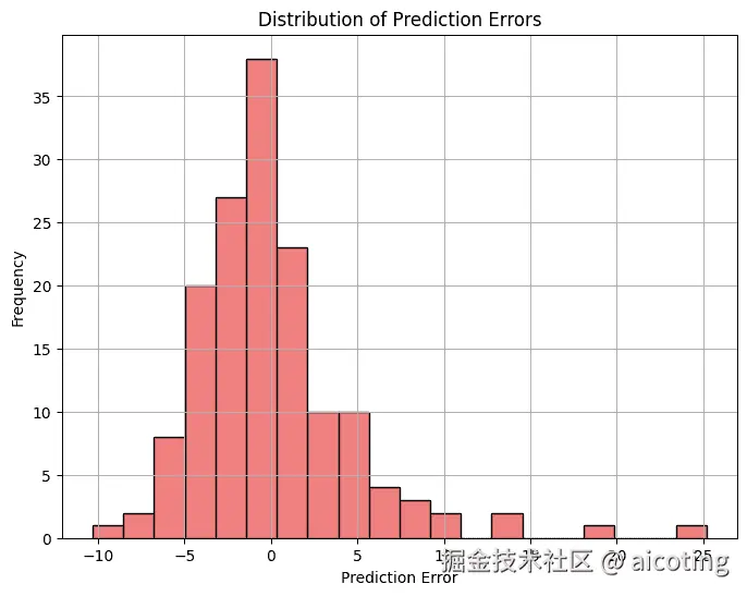 附近表示预测的准确,偏离线越远表示误差越大,第二个误差分布直方图展示预测误差的分布,中心集中表示模型预测稳定,偏离大表示存在异常预测。