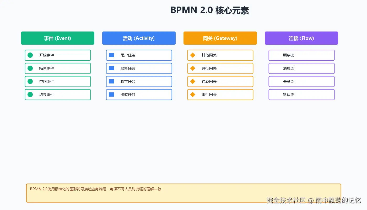 BPMN(Business Process Model and Notation)是业务流程建模与 notation 的标准。BPMN 2.0定义了一套标准的图形符号来表示业务流程。