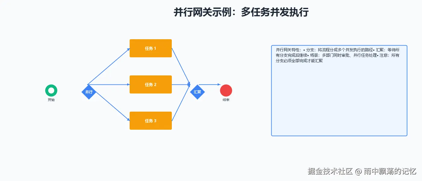 - 网关(Gateway):控制流程分支,如排他网关、并行网关