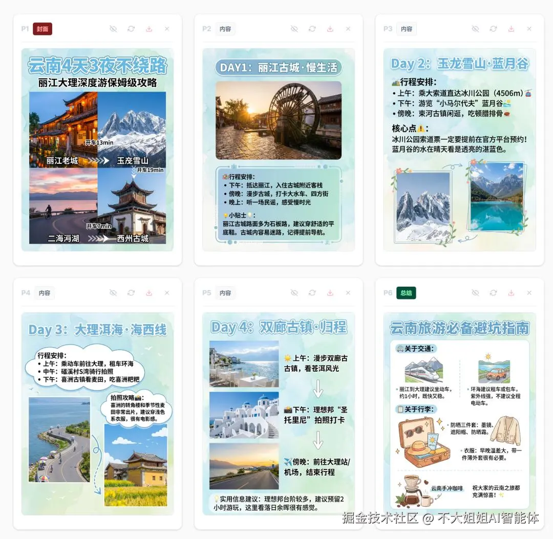 案例 A:昆明+大理旅游攻略 对于旅行社获客来说,这种高颜值的景点攻略一键生成简直是引流杀手锏。