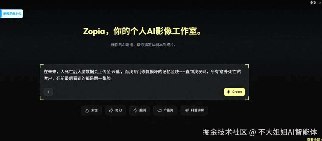 在 Zopia 里的第一步是输入你的创意。比如你有一个关于“未来云墓地记忆修复师”的科幻点子,它不会只给你一段干巴巴的文字,而是会调用编剧 Agent,根据你的 Idea 自动构造故事结构。