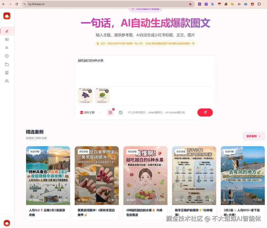 第一步:输入主题,也可以根据需要上传参考图。 不管是做旅游私域引流的“昆明大理攻略”,还是做养生图文”,给它一个方向就行。