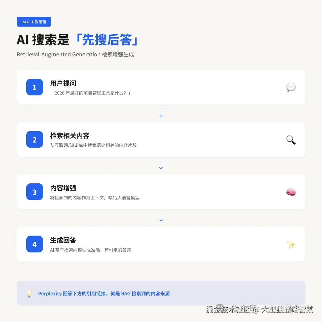 这就是为什么 Perplexity 的回答下面总有引用链接——那些就是它检索到的内容来源。