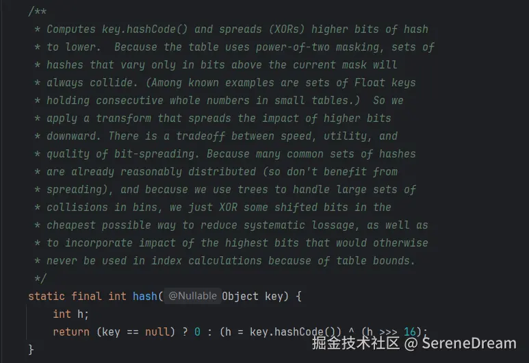 - 为什么要按位异或:为了扰动函数 (Perturbation) ,能让哈希值的高位与低位都参与运算,让高位的信息也参与到下标计算中,把“冲突”的概率降到最低。