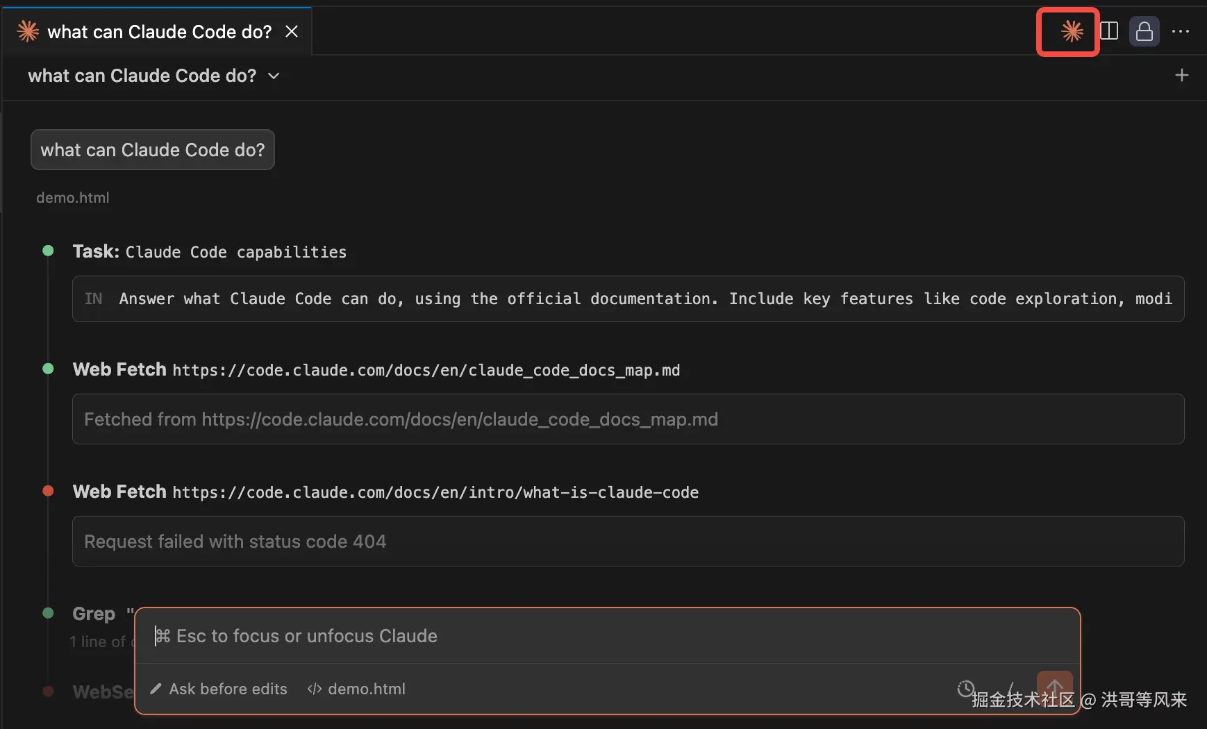 安装完成后,点击 VSCode 右上角的 Claude Code 图标,进入 Claude Code 页面,待初始化完成后即可开始使用: