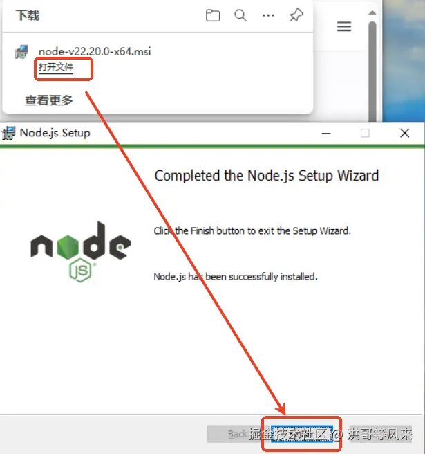 选择 Node.js 版本 + 操作系统 + 架构,把 msi 文件下载到本地: