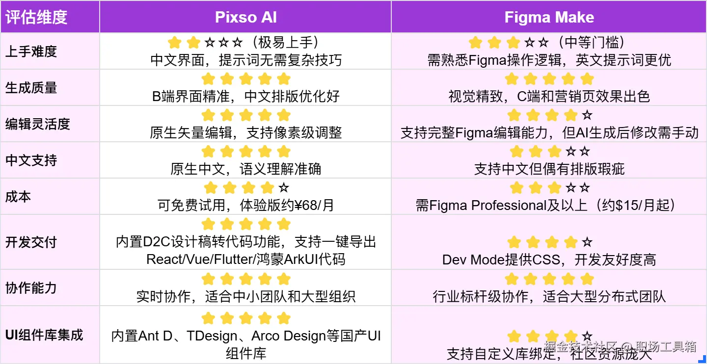 Figma Make更契合现有工作流。无需迁移历史文件,生成的设计稿能立即接入现有的Design System和开发流程。全球协作时,Figma的稳定性和生态成熟度仍是当前最优解。