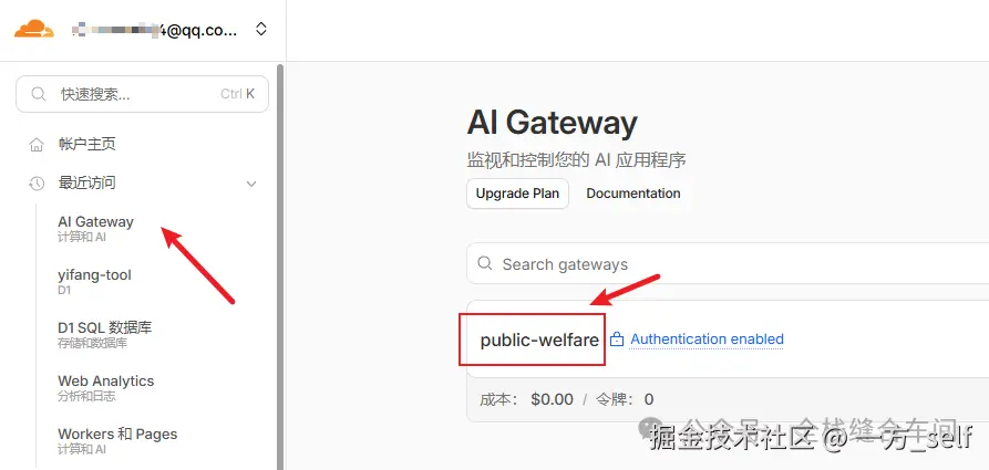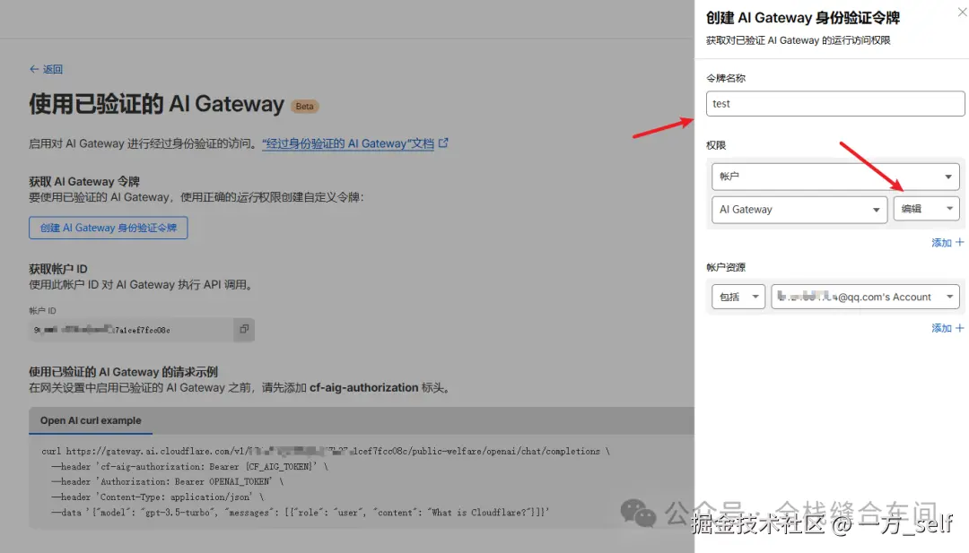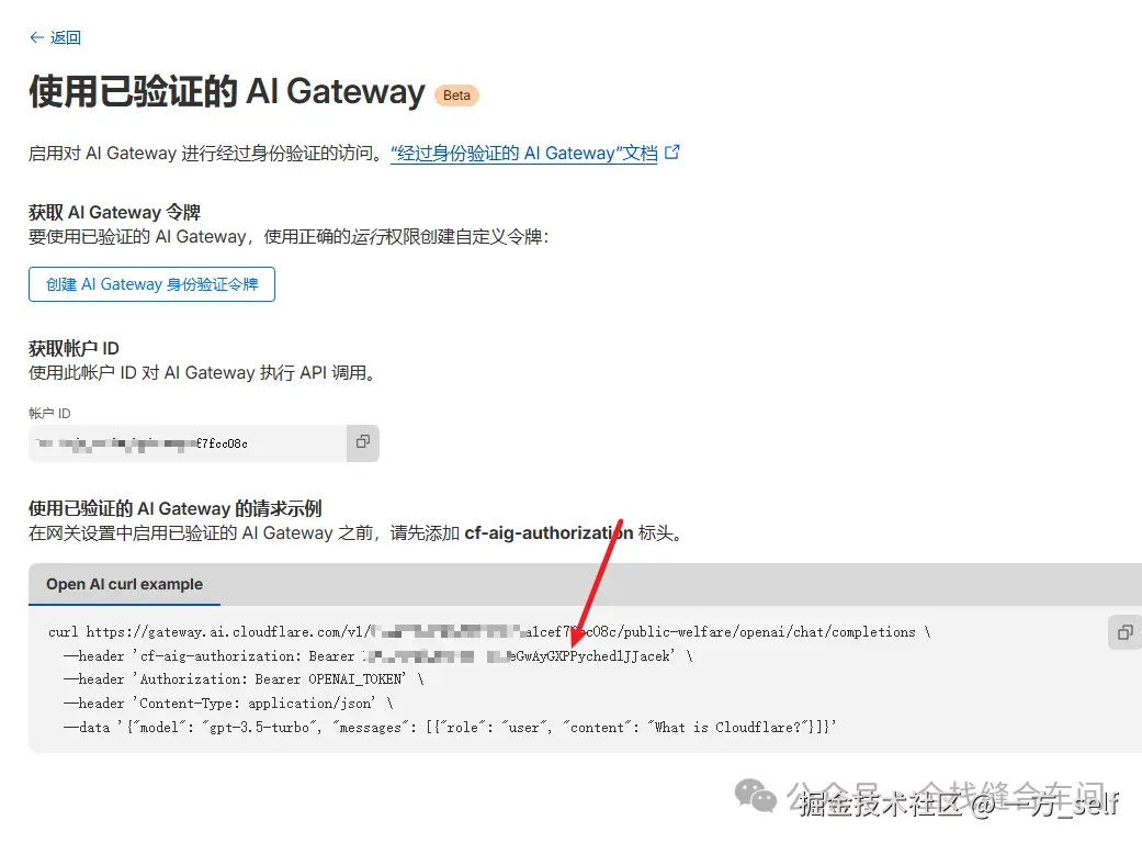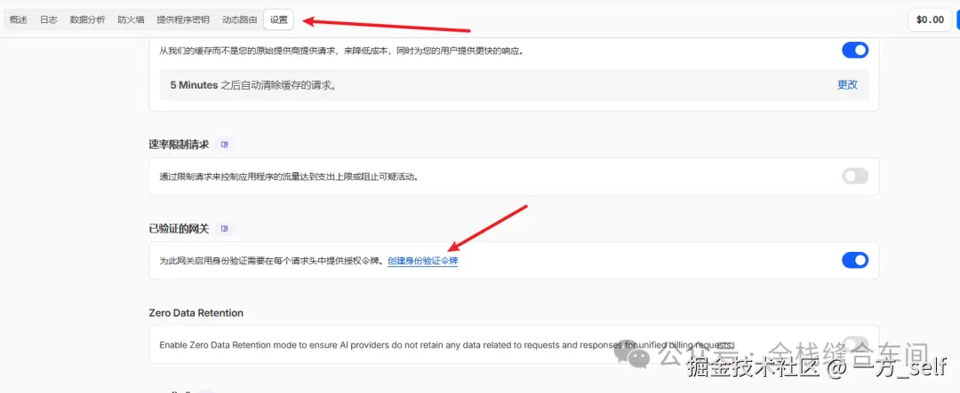 我们进到网关,点击设置,创建身份验证令牌:记下生成的令牌,通过cloudflare AI gateway请求自定义大模型的curl: