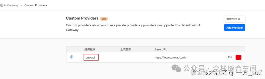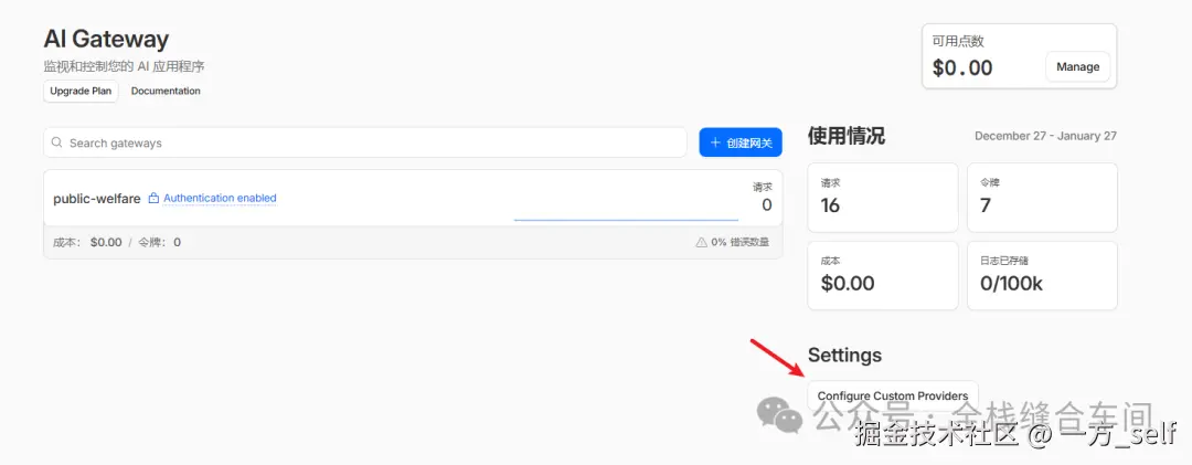 我们回到ai gateway的首页: dash.cloudflare.com/?to=/:accou… 可以看到网关创建好了,我们点击配置自定义服务商: