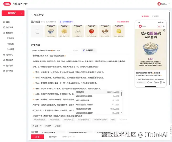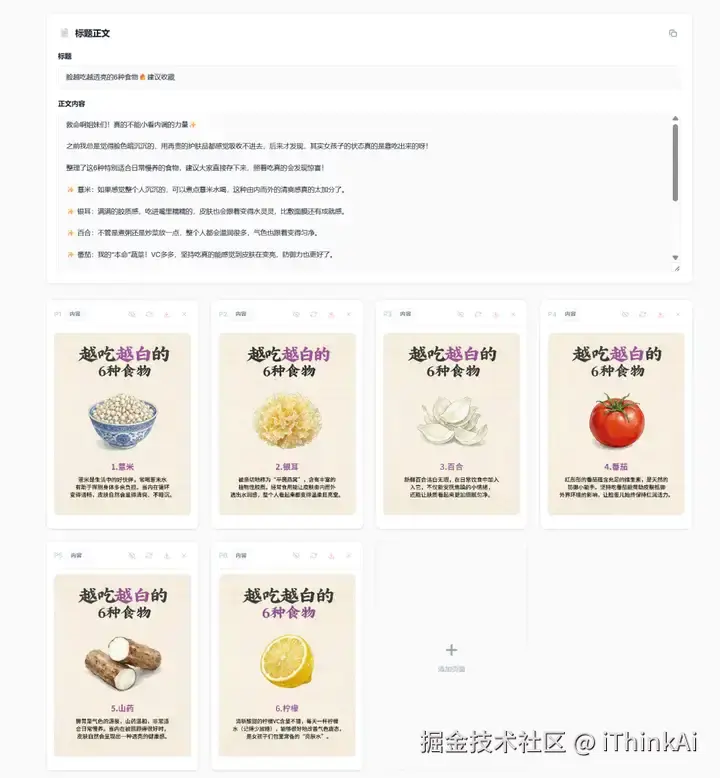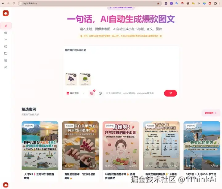 •第一步:输入主题。 你可以直接扔一个关键词,比如“越吃越白的6种水果”,甚至可以直接上传一张参考图,让 AI 学习你的审美风格。