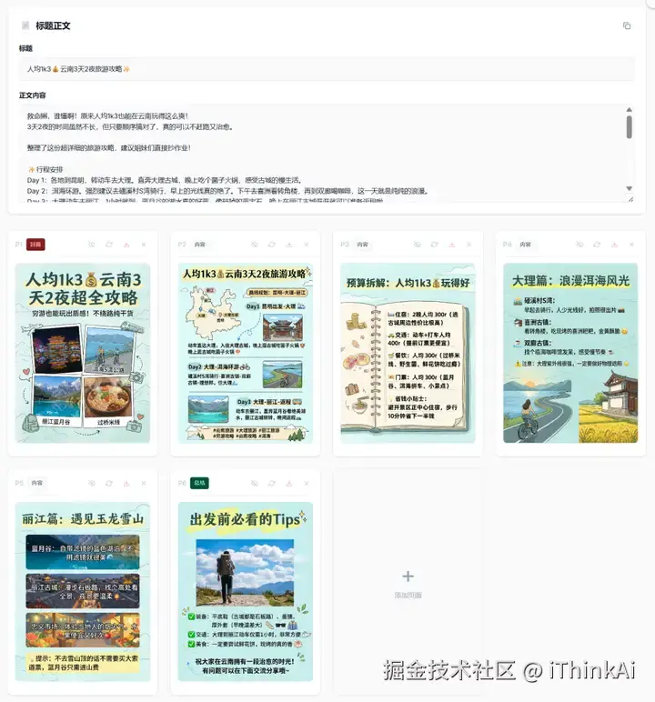 它最核心的能力就是:【一句话生成小红书/小绿书图文】。而且它解决了之前 AI 生成图片风格不统一的顽疾,背景色、字体排版能做到高度一致,非常适合【旅游私域引流】或【产品种草图文】。