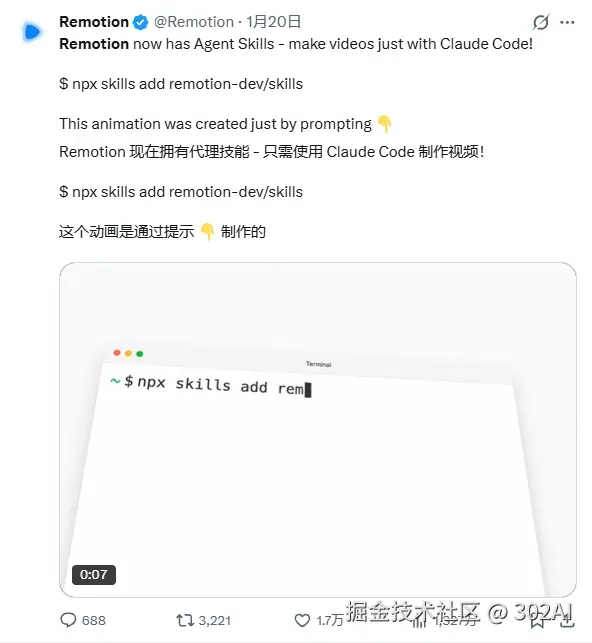 Remotion Skill的出现,彻底打破了这个门槛。