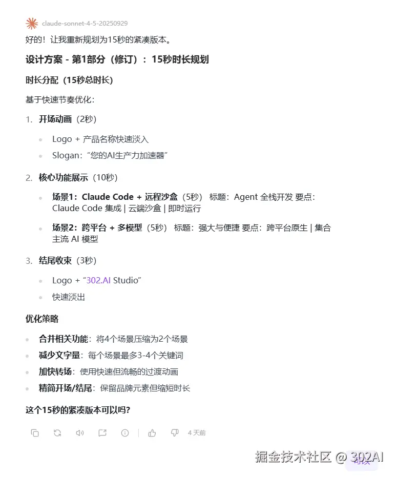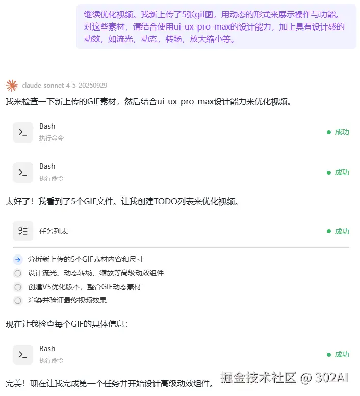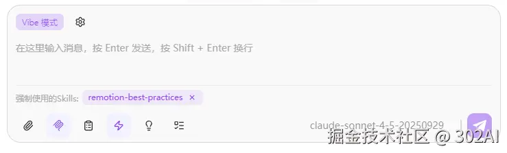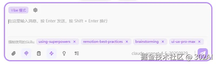 使用配置: 302.AI客户端Vibe模式 + Claude Sonnet 4.5 + Sklls:Remotion,Superpowers,Brainstorming,UI-UX-Pro-Max