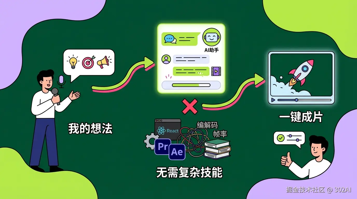 - 与 AI 的天然契合: 到了 2026 年,为什么 Remotion迎来了这波爆火?因为 AI 最擅长写代码,而不是操作复杂的 GUI 界面。 当你想让 AI 帮你生成一个复杂视频时,让它去操作剪映是很累的;但让它写一段 React 代码,它能瞬间完成,且逻辑极其精准。