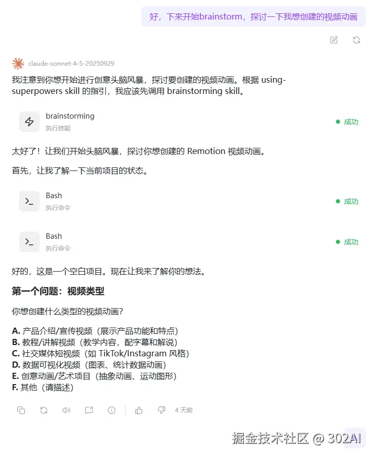 对于Remotion这个新技能,我决定沿用这套方法论。不看任何文档,直接让AI通过brainstorm来帮我明确项目目标。这也是Skills生态的魅力所在:使用不同的Skills互相配合,形成完整的 工作流 。