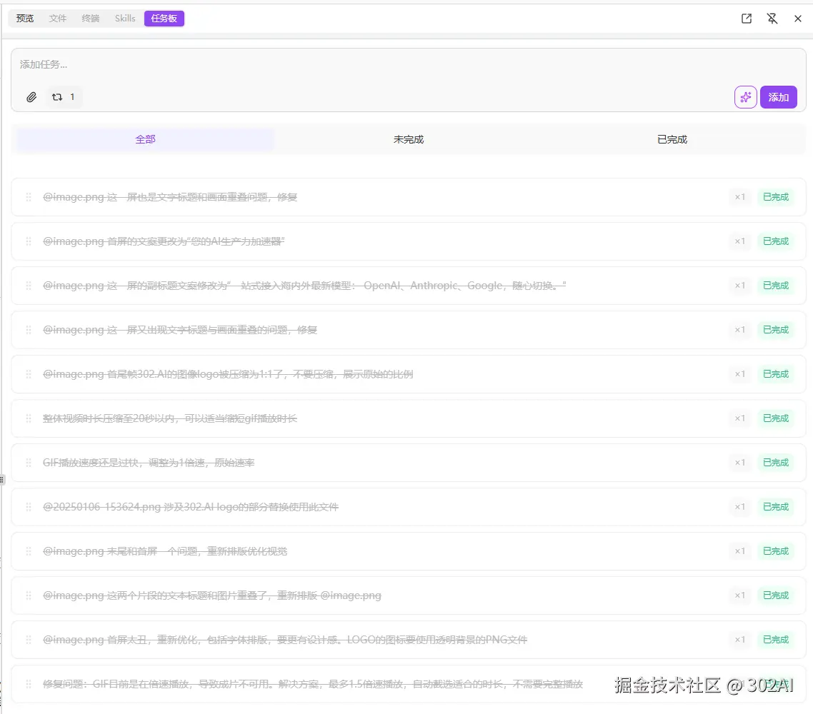 相信读过上一篇文章的朋友已经知道该怎么做了:把所有要改的点添加到任务板,让AI按顺序,依次执行。