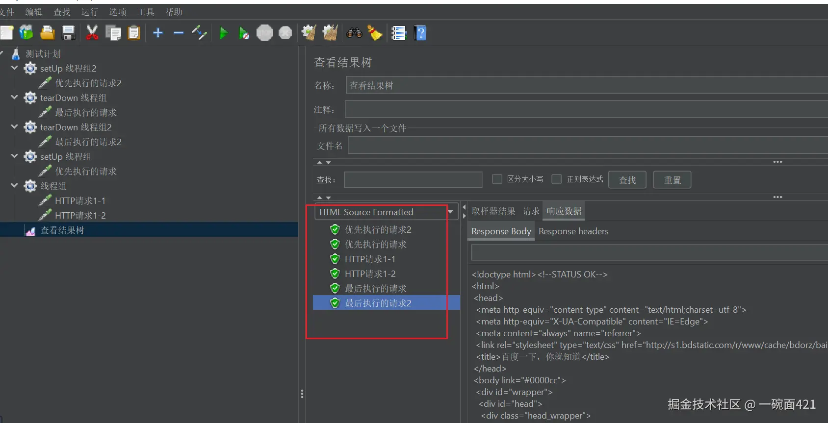 - 现在 查看结果树,线程组,线程组2平级。都是在测试计划下面。