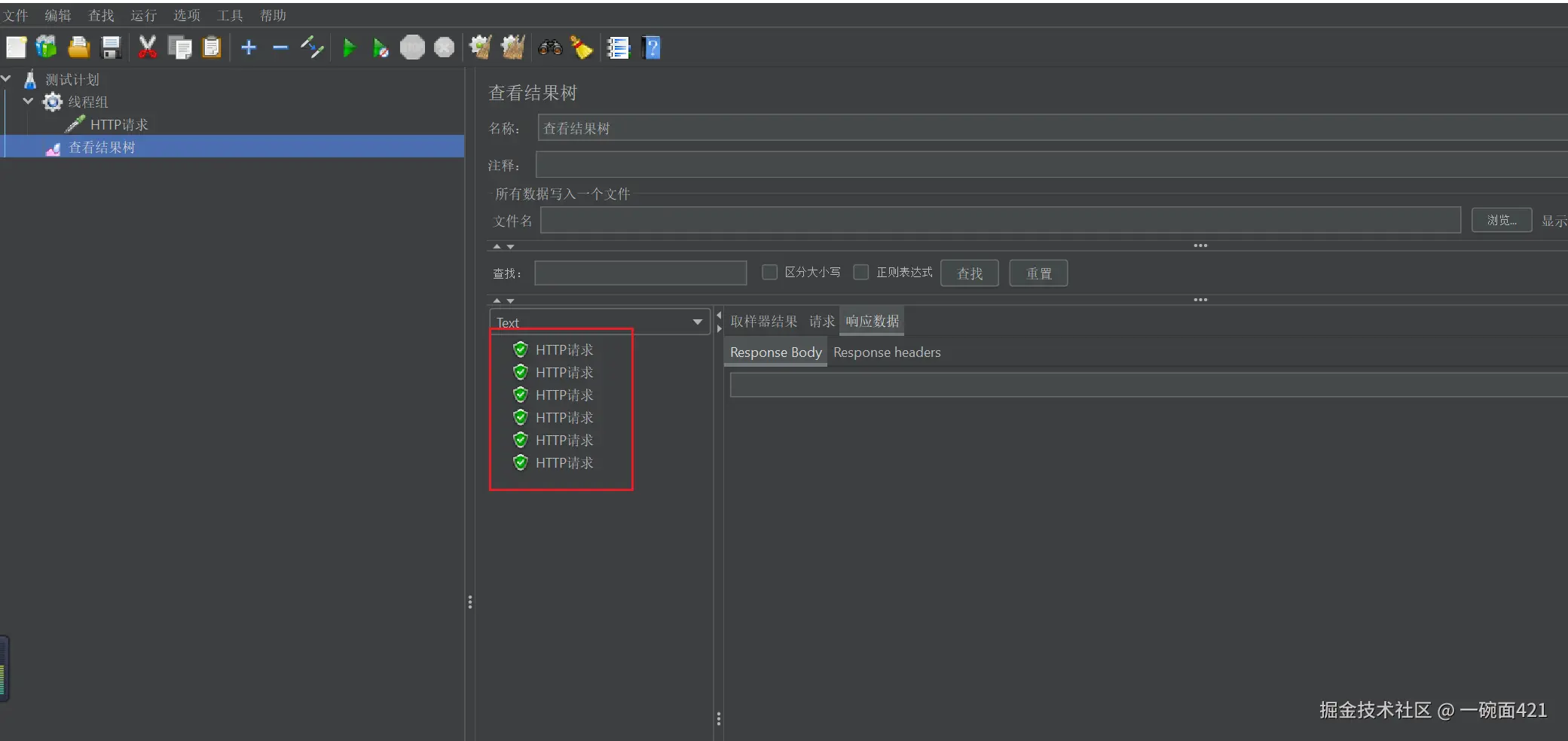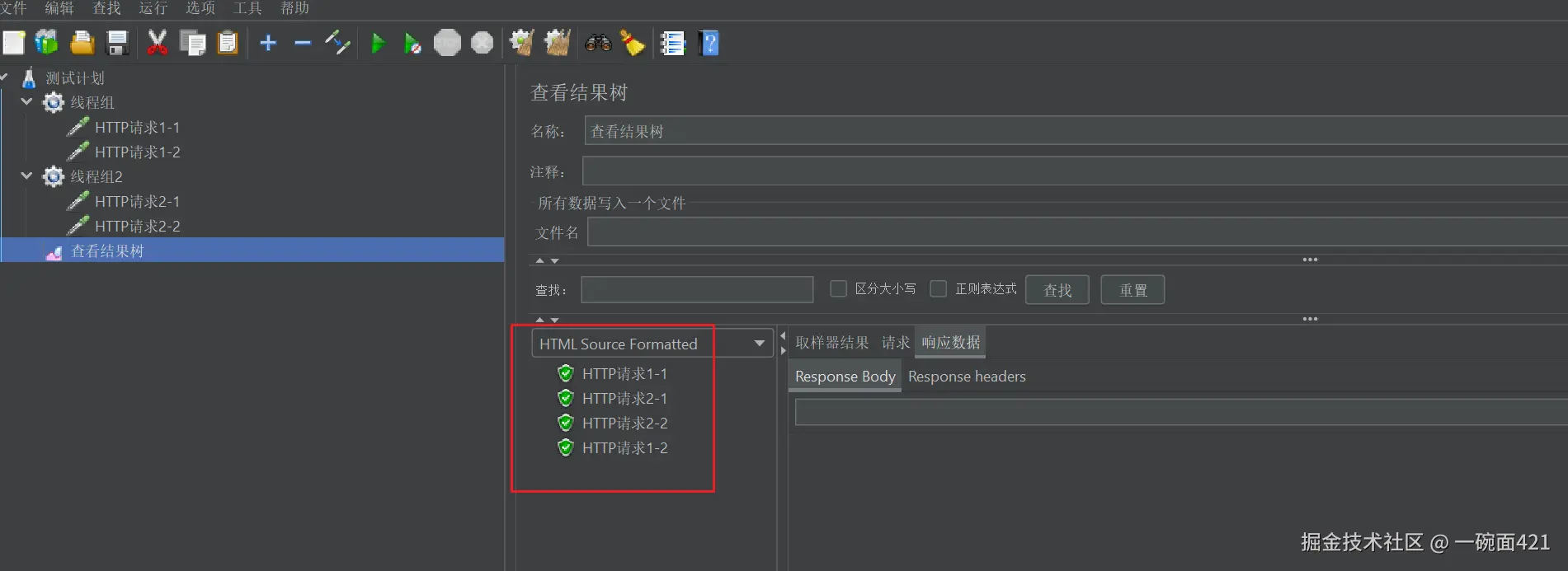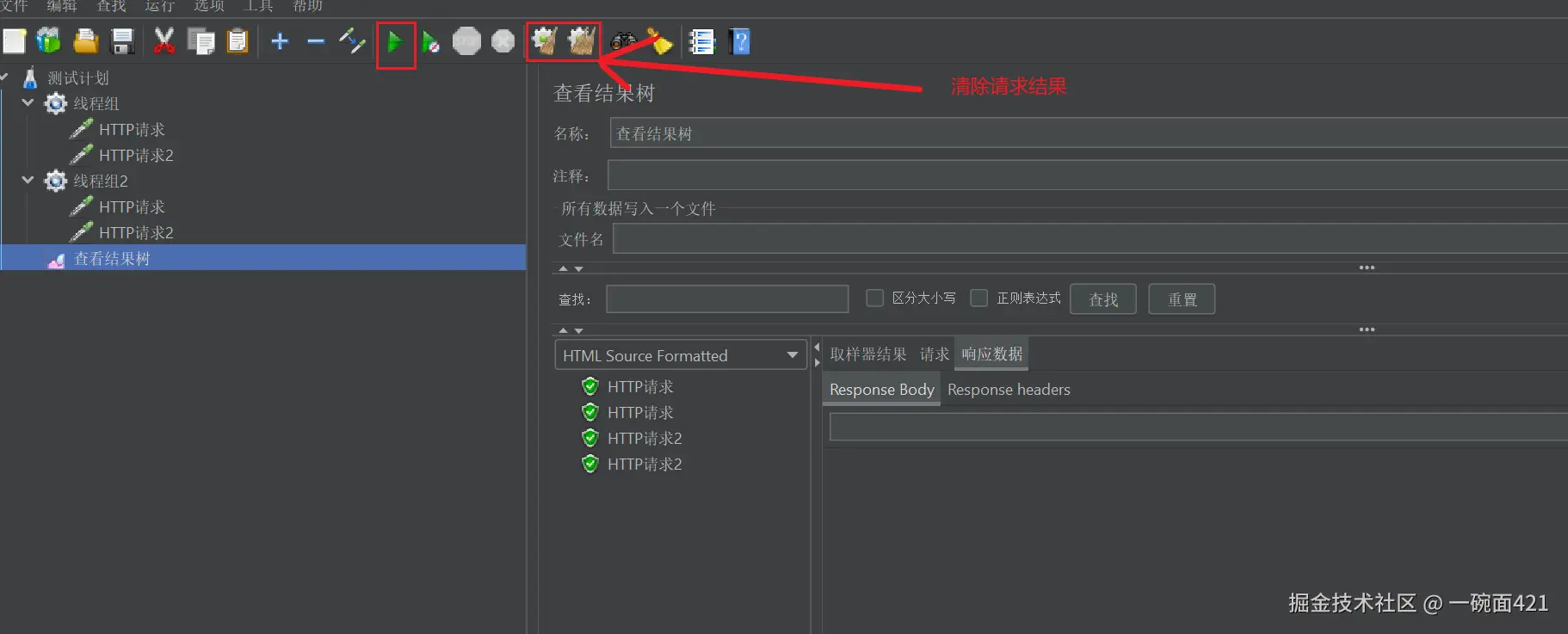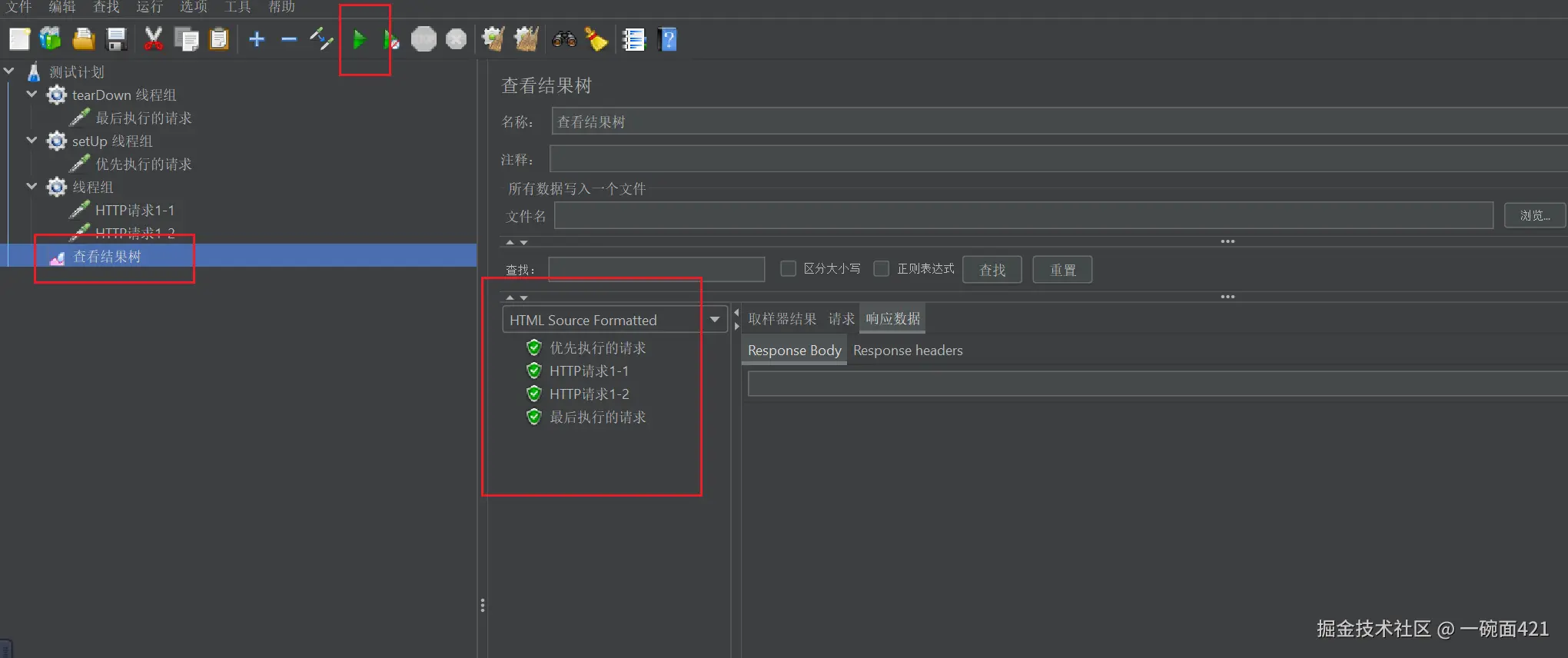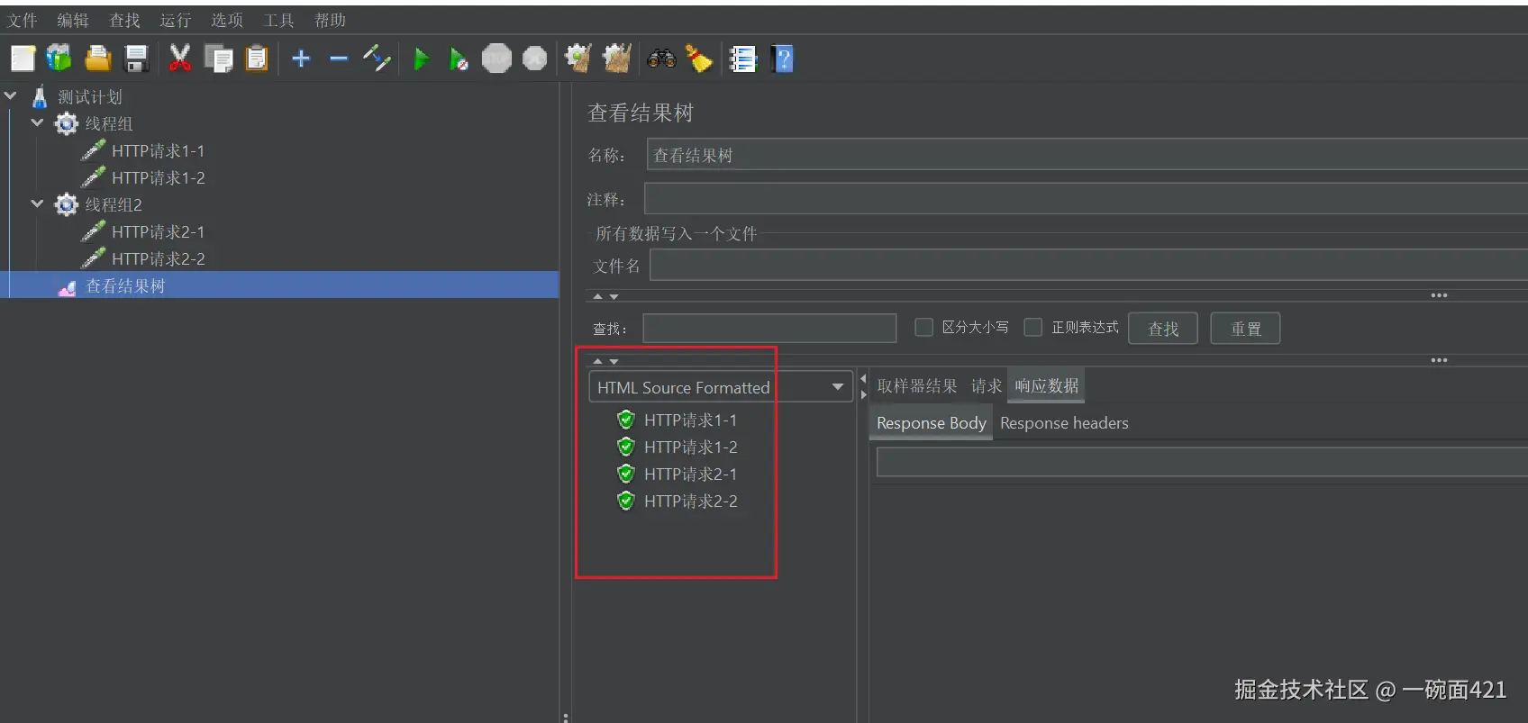 选中查看结果树点击运行按钮。我们可以看到四个请求全部发送