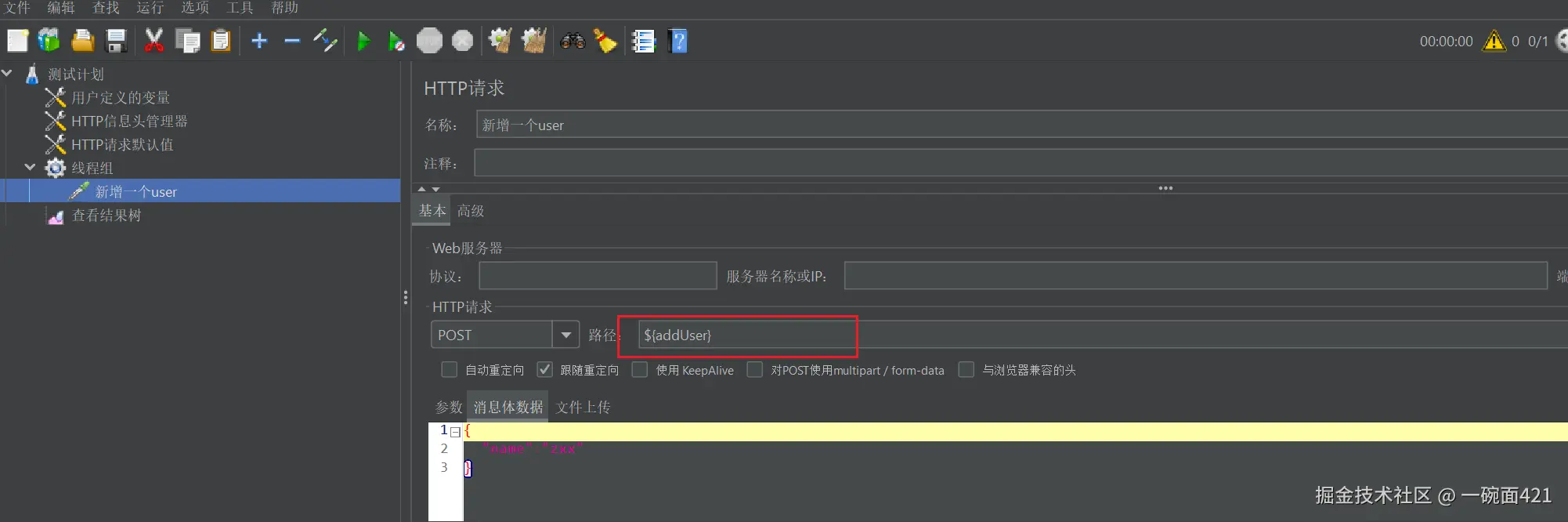 - 点中Http请求,ctrl+c。 再点中线程组 ctrl+v,复制一个Http请求(改个名字改成Http请求2)