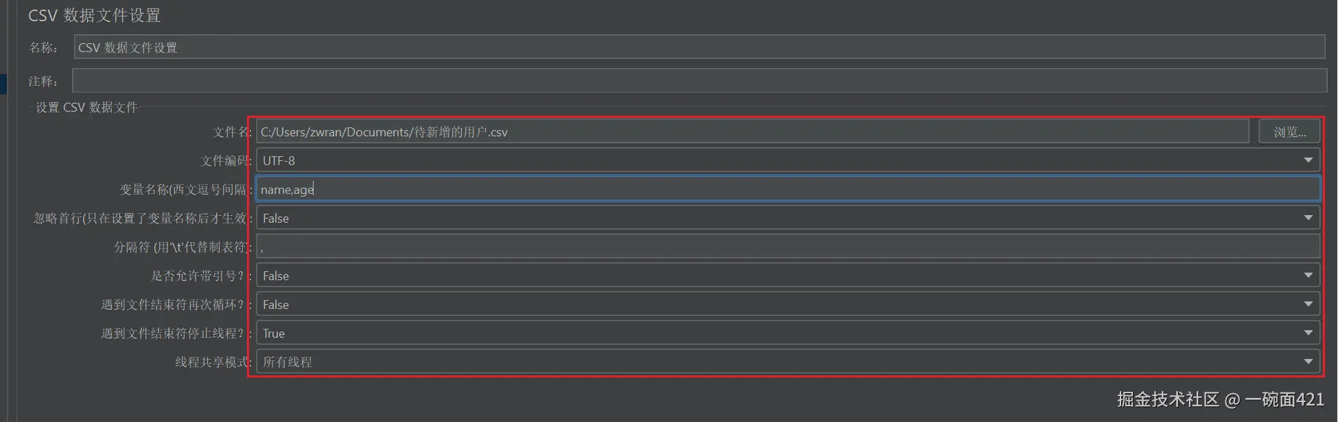 - 我们的csv中有两列。我们在变量名称那一行定义好变量名用英文逗号分割
