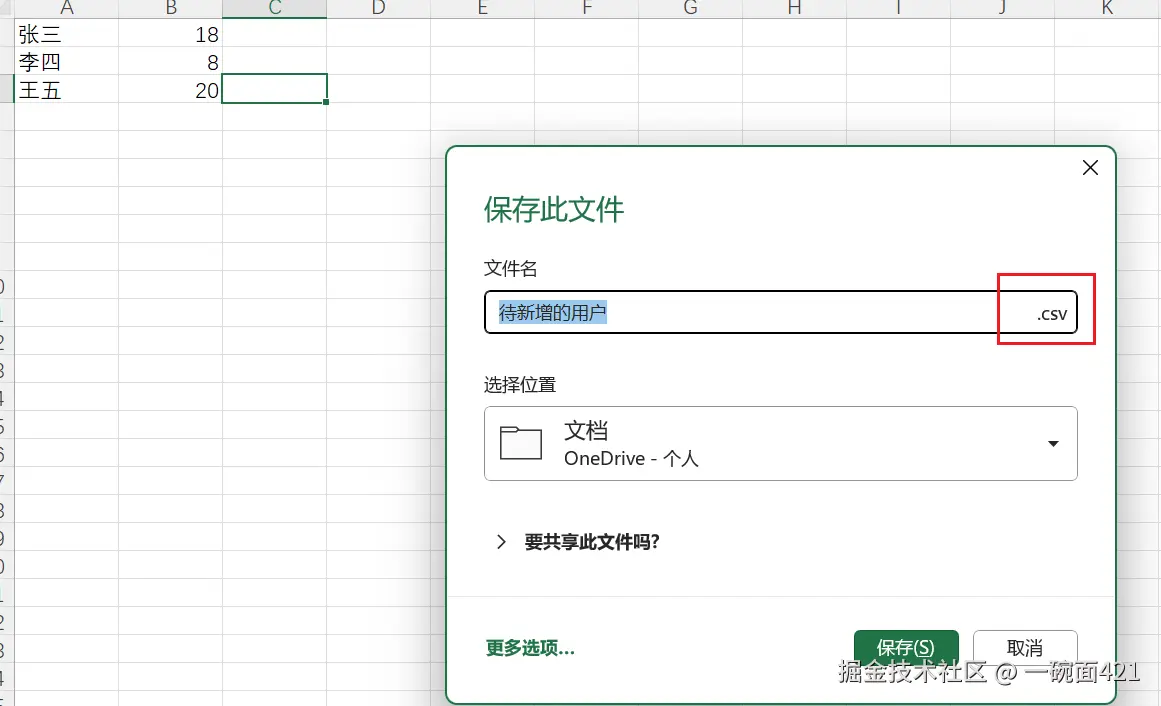 - 我们先用Excel写好三个用户并另存为csv文件。