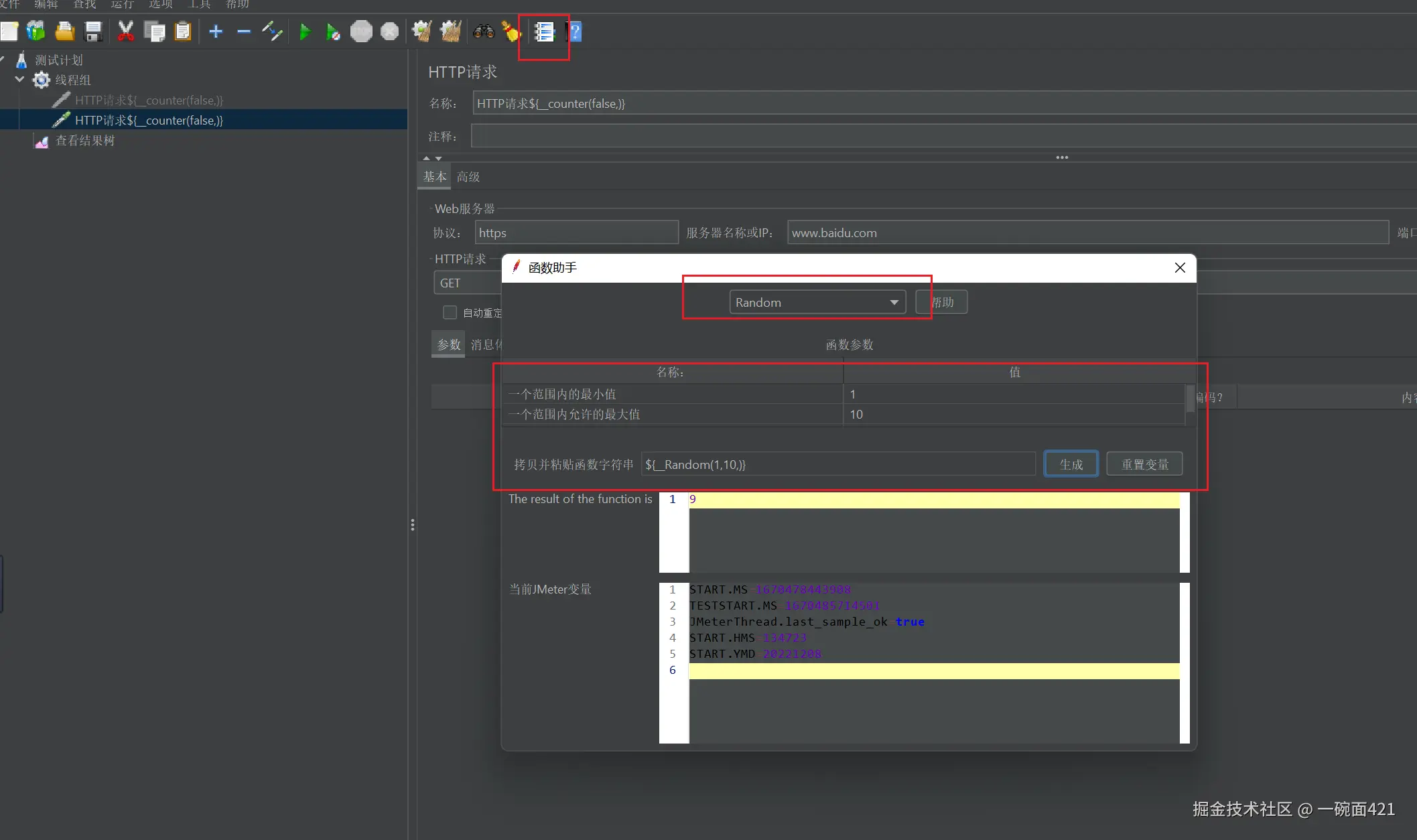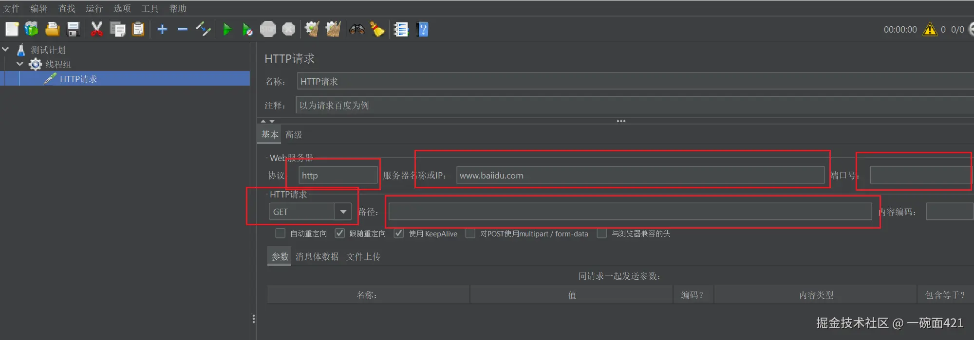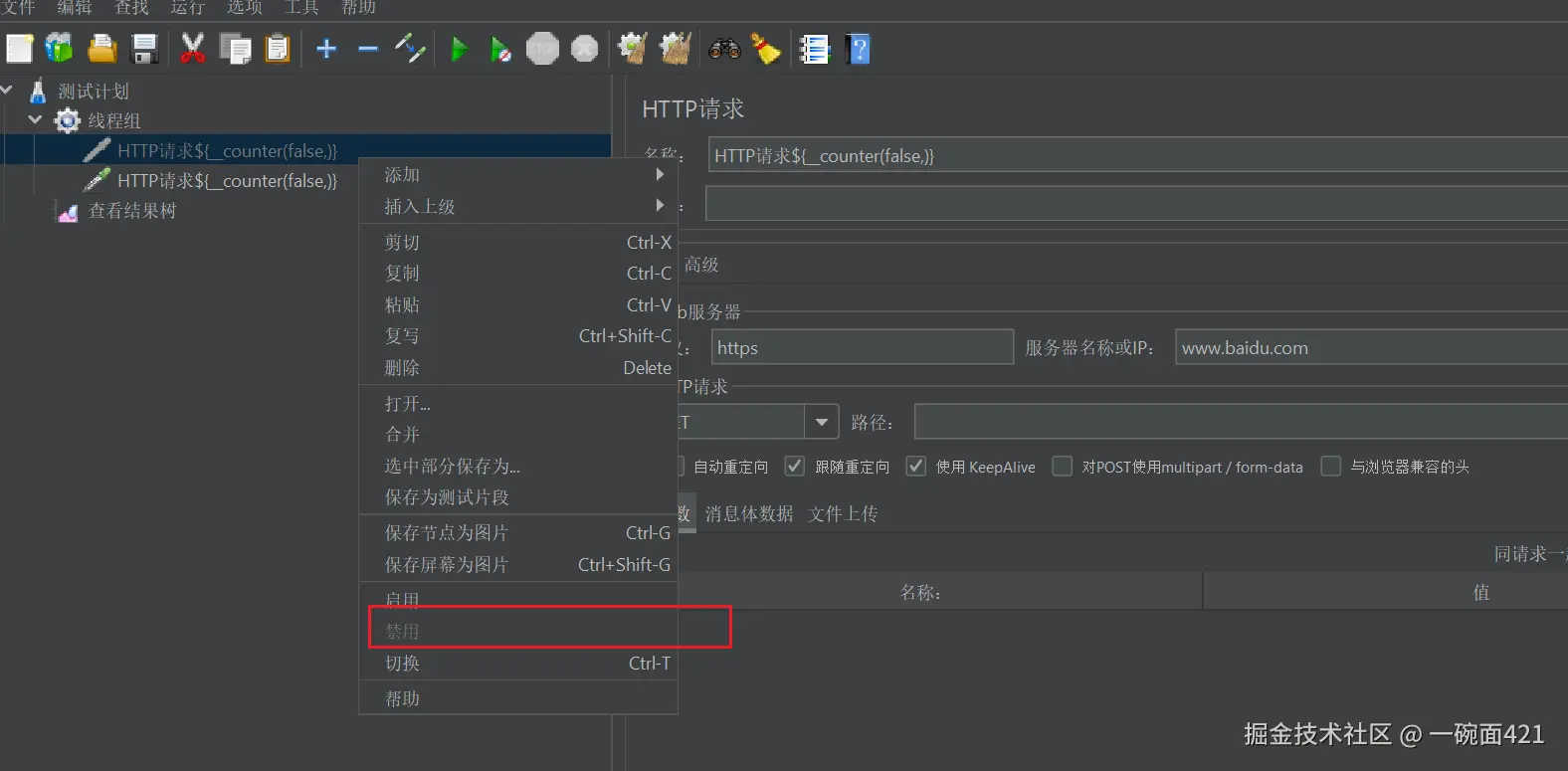 - 我们定义一个请求百度的http请求,并给线程组设置如下