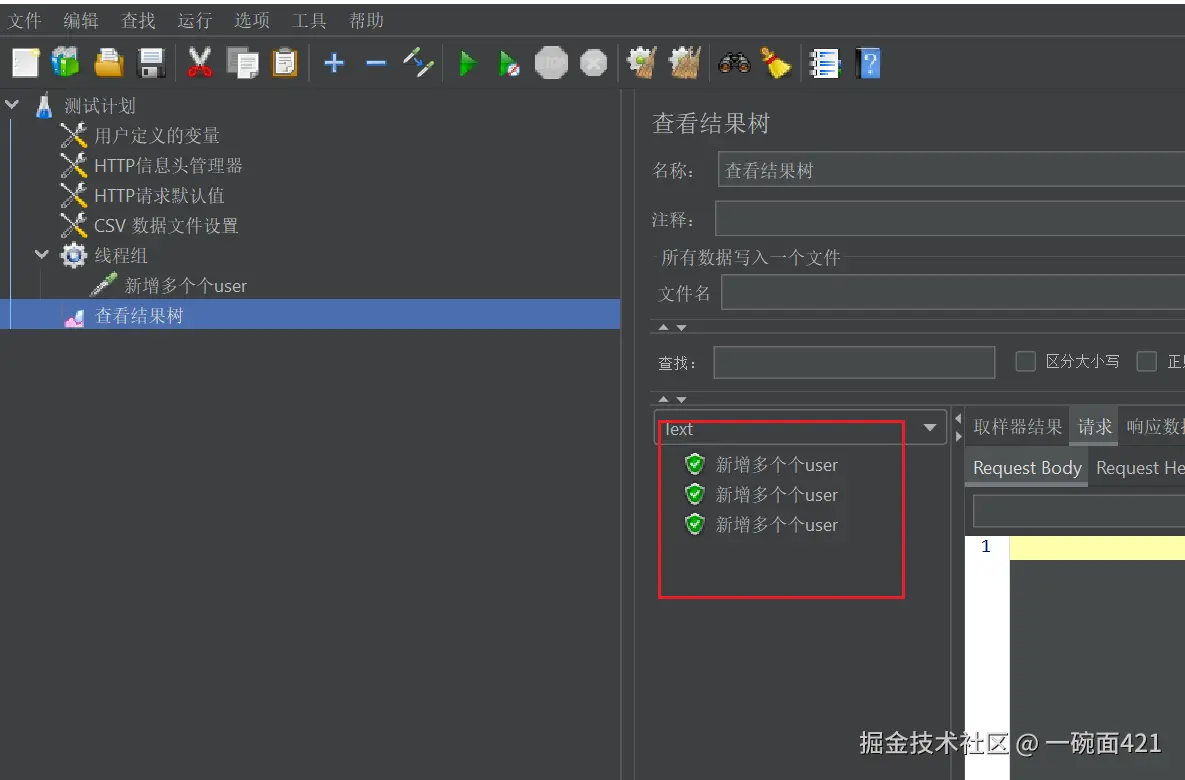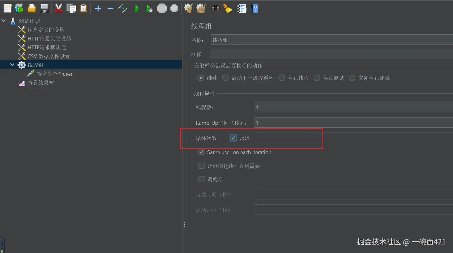 我们发现只是新增了一个。还有的数据没有新增。是因为我们还需要做一项设置,把线程组的永远勾上。就会循环添加所有用户了。