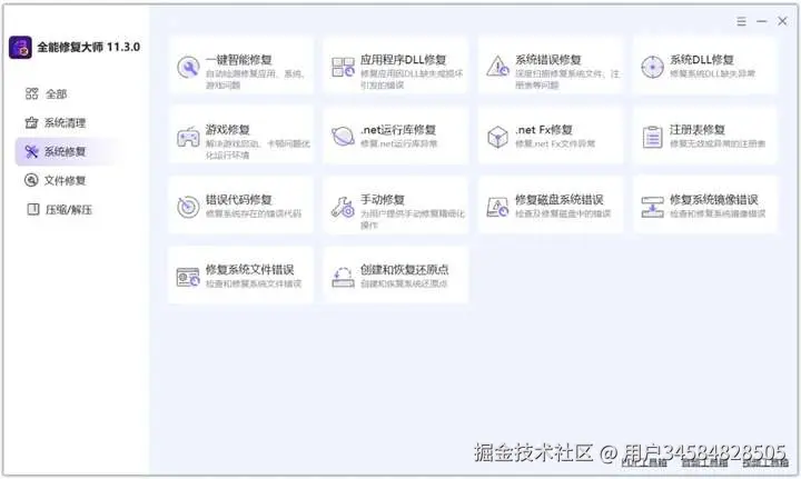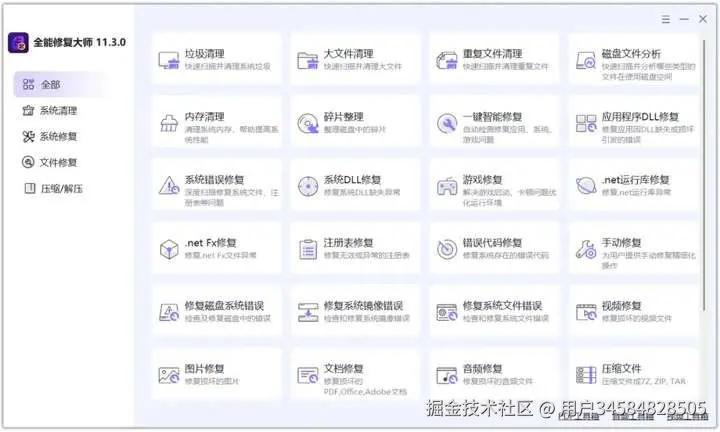 在我们使用windows操作系统时,基本上都会遇到系统卡顿、蓝屏、应用程序无法正常打开、重要文件被误删除、音视频、文档、图片等文件损坏无法正常打开等情况,而现在很多系统修复工具要么需要氪金才可以使用,要么功能不完善,那么今天我就来给大家分享一款集成了众多系统以及文件修复功能的全能修复工具,它完全免费,安装后就可以无限制的使用。