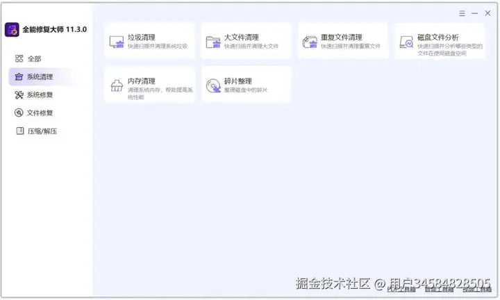 在软件的界面可以看到,它分为系统清理、系统修复、文件修复和压缩解压四大类别。