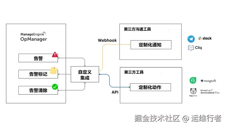 没有哪款集成能适配所有应用场景,因此 OpManager 将定制权完全交给您。其自定义集成基于 API 地址与 Webhook 实现:当 OpManager 生成告警或执行告警操作时,可同步至第三方工具,并触发您在 ITSM、ITIL® 或协作聊天工具中定义的操作。