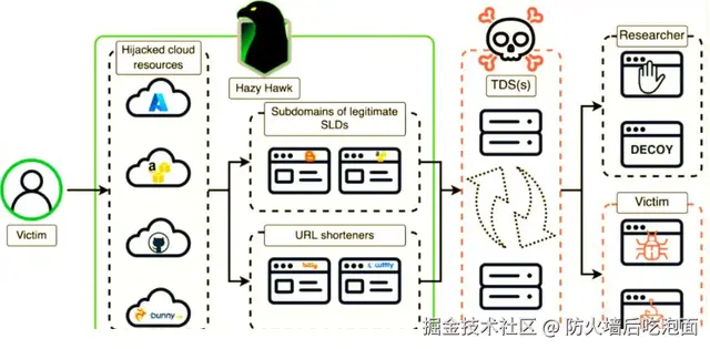 2025年6月,名为“HazyHawk”的黑客团伙通过劫持废弃DNS CNAME记录,接管了大量政府、高校及跨国企业的可信子域名,用于分发诈骗内容、虚假应用与恶意广告。其攻击手法非常隐蔽:先扫描带有指向废弃云端点的CNAME记录的域名,再注册与废弃资源同名的新云服务,使原始子域自动解析至攻击者控制的站点。