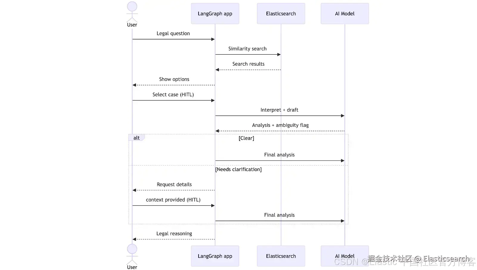 当律师提交一个法律问题时,工作流开始执行。系统会在 Elasticsearch 中执行向量搜索,检索最相关的判例,并使用自然语言将它们呈现给律师进行选择。完成选择后, LLM 会生成一份分析草稿,并检查信息是否完整。此时,工作流可以走两条路径之一:如果一切清晰,则直接生成最终分析;如果不清晰,则暂停并向律师请求澄清。在补充缺失的上下文之后,系统会结合这些澄清完成分析并返回结果。