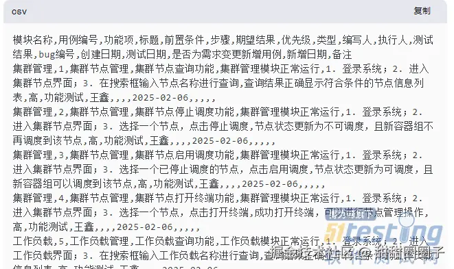2、生成测试用例并转换格式:AI 工具根据关键词生成测试用例,将生成的用例拷贝到文本编辑器中,并转换为 CSV 格式。