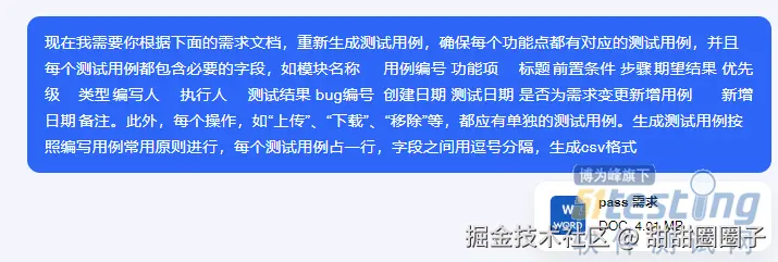 1、上传文档并指定关键词:将软件需求文档或设计文档上传到 AI 工具中,并指定生成测试用例的关键词。
