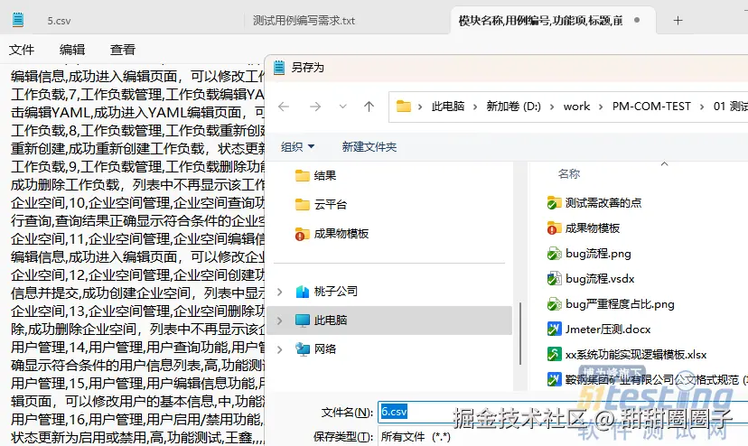 3、转换为 CSV 格式:为了方便后续导入到测试管理工具中,我们需要将文本格式的测试用例转换为 CSV 格式。另存为csv。