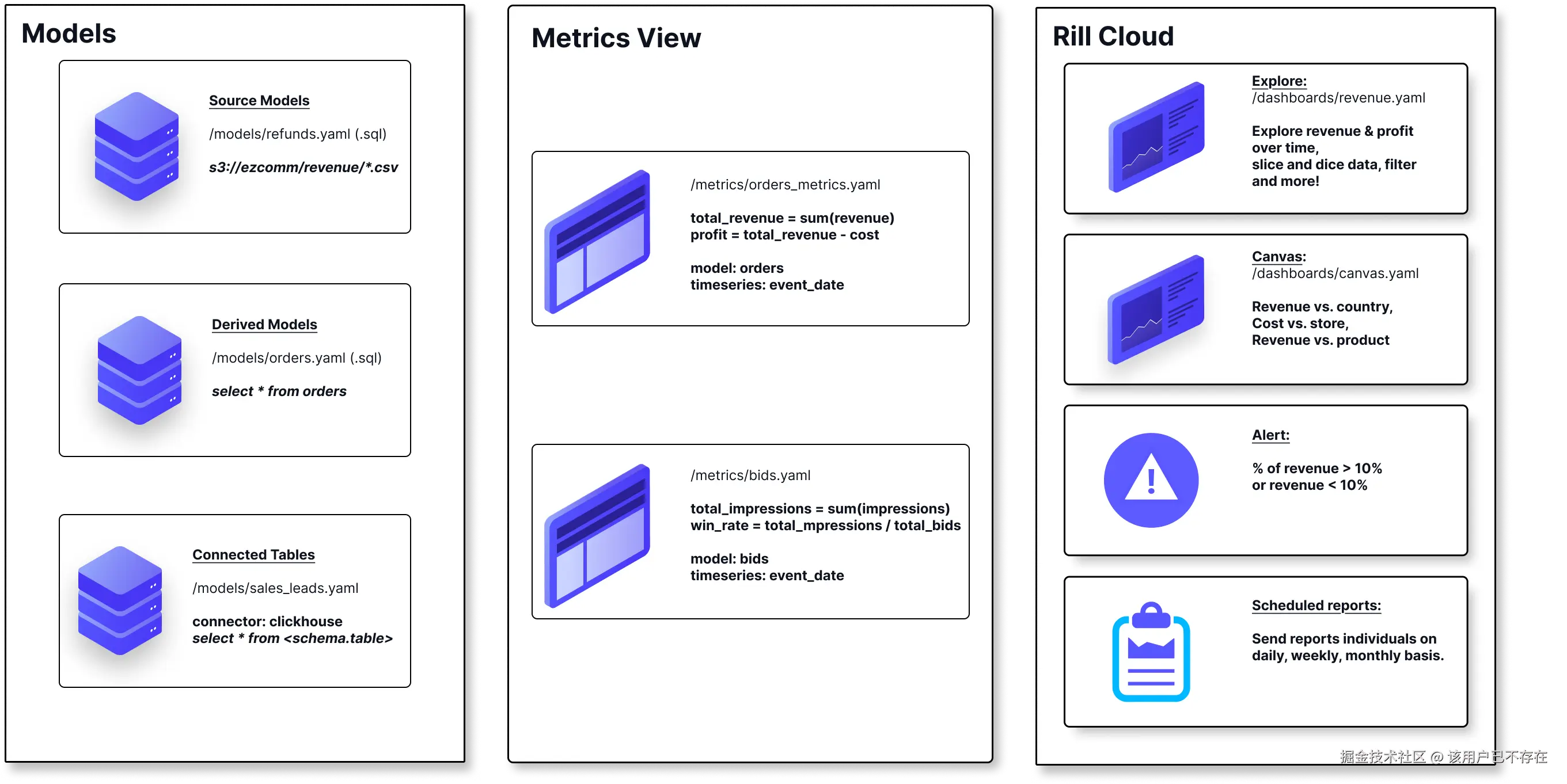 虽然 Rill 更像是一个工具而非传统的 Python 库,但它在现代 Python 数据栈中地位独特。Rill 基于 DuckDB,能够快速读取本地数据(CSV, Parquet),并瞬间生成交互式的 BI 仪表盘。它解决了“为了看个图表还要搭一套 Superset”的痛点,非常适合快速探索数据分布。