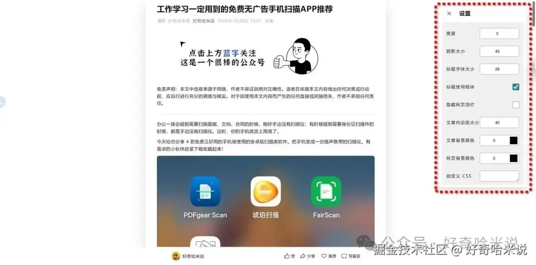 对比效果非常好,可以看到不仅去除了以下影响阅读的浮动元素,还贴心的给文章设置了阴影,阅读体验提升不少。