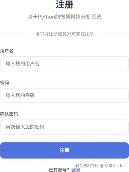 基于上述数据采集、预处理与分析逻辑,我们搭建完整的微博舆情数据分析系统,采用B/S架构,分为用户管理、数据管理、数据分析与可视化三个核心模块,适配政府、企业等不同场景的舆情监测需求。
