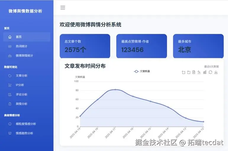 作为长期深耕数据分析领域的从业者,我们曾承接过微博舆情监测相关客户咨询项目,帮助客户搭建高效的舆情分析体系,解决数据采集低效、情感分析不精准、可视化效果不佳等痛点。本文内容改编自过往客户咨询项目的技术沉淀并且已通过实际业务校验,该项目完整代码与数据已分享至交流社群。阅读原文进群,可与800+行业人士交流成长;还提供人工答疑,拆解核心原理、代码逻辑与业务适配思路,帮大家既懂 怎么做,也懂 为什么这么做;遇代码运行问题,更能享24小时调试支持。