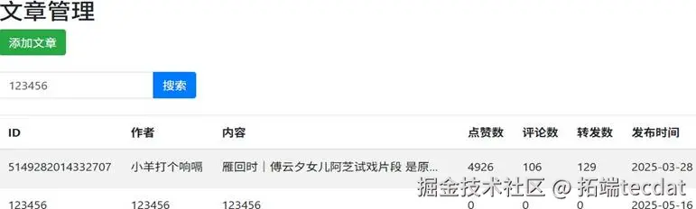 - 数据管理模块:实现微博文章、评论数据的增删改查,支持数据批量处理与精准检索;