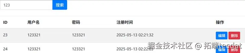 # 中文注释:该代码位于views/user.py文件,省略蓝图初始化代码from flask import request, redirect, render_template, session, jsonifyfrom datetime import datetime# 中文注释:导入数据库操作函数,省略数据库连接代码from db import querys# 中文注释:用户注册路由@app.route('/register',methods=['GET','POST'])def user_register(): if request.method == 'POST': # 中文注释:获取表单数据,转换为字典格式 form_data = dict(request.form) # 中文注释:获取当前时间,作为注册时间 register_time = datetime.now().strftime('%Y-%m-%d %H:%M:%S') # 中文注释:验证两次密码是否一致 if form_data['password'] != form_data['passwordCheked']: return '两次密码输入不一致,请重新输入' # 中文注释:查询数据库,判断用户名是否已注册,省略部分查询优化代码 def check_username(item): return form_data['username'] in item user_list = querys('select * from user', [], 'select') exist_user = list(filter(check_username, user_list)) if exist_user: return '该用户名已被注册,请更换用户名' # 中文注释:将新用户信息插入数据库,省略数据验证代码 querys('insert into user(username,password,createTime,role) values(%s,%s,%s,%s)', [form_data['username'], form_data['password'], register_time, 'user']) # 中文注释:注册成功,重定向到登录页面 return redirect('/user/login', 301) # 中文注释:GET请求,渲染注册页面 return render_template('register.html')
