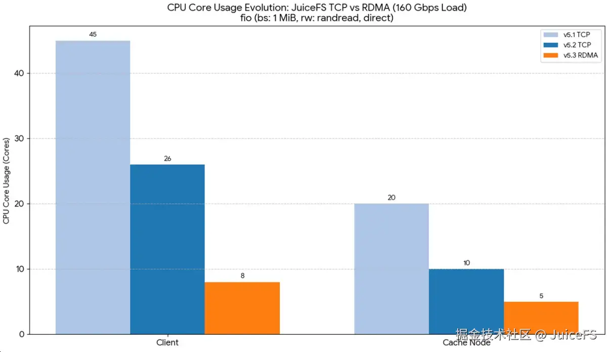 我们使用了 160 Gbps 网卡进行 1MB 随机读测试,比较了 5.1、 5.2(使用 TCP 网络) 和 5.3 版本(RDMA),并观察了 CPU 占用情况。测试表明,RDMA 有效降低了 CPU 占用。在 5.2 版本中,CPU 占用了近 50%;而在 5.3 版本中,通过 RDMA 优化,CPU 占用降至约 1/3。客户端和缓存节点的 CPU 占用分别降至 8 核和 5 核,带宽达到了 20 GiB/s。