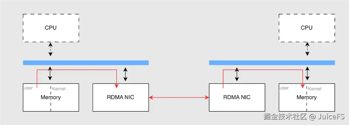 在 JuiceFS 中,客户端与元数据服务之间的网络请求消息都较小,现有的 TCP 配置已能满足需求。而在分布式缓存中,客户端与缓存节点之间传输的是文件数据,使用 RDMA 可以有效提升传输效率,降低 CPU 消耗。