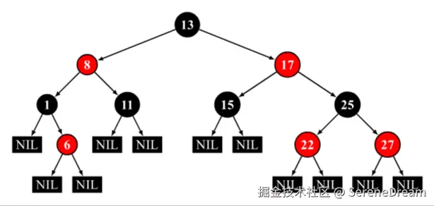 红黑树是一种自平衡的二叉搜索树。每个节点额外存储了一个 color 字段 ("RED" or "BLACK"),用于确保树在插入和删除时保持平衡。