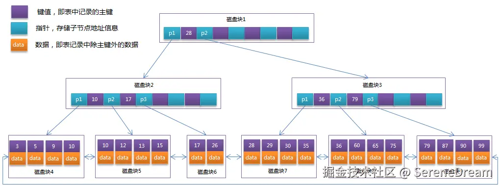 磁盘上的一个块/页 (Disk Block/Page) = B树中的一个节点 (B-Tree Node)