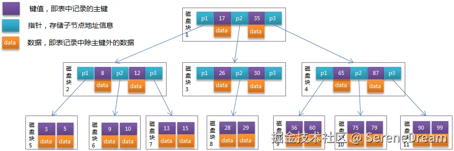 事实上,在 B 树 的生成过程中,磁盘需要频繁返回数据给内存,每需要生成一个节点,都要进行一次 I/O 操作、I/O 操作可以看作磁盘块扫描次数,比如下图的B树,扫描了 11 个磁盘块(进行 11 次 I/O 操作)