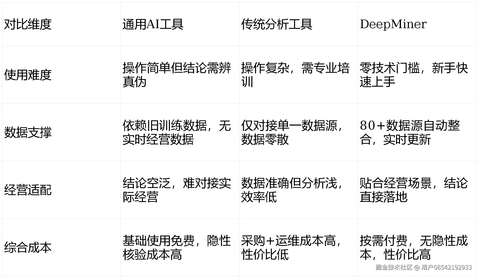 DeepMiner不走“技术复杂化”路线,核心是围绕中小企业经营场景设计,以商业智能代理为核心,三层架构层层赋能,既解决数据处理效率问题,又守住结论可信度底线,同时控制使用成本与操作门槛,完全区别于通用AI和传统工具。